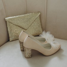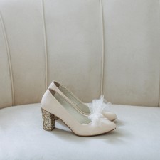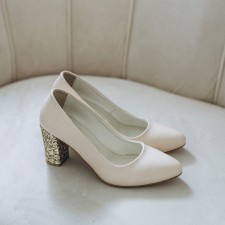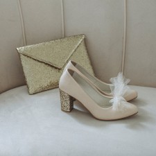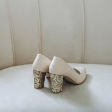 Piękne lśniące czółenka na stabilnym obcasie w kolorze srebrnego brokatu.